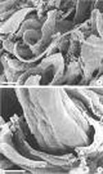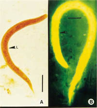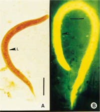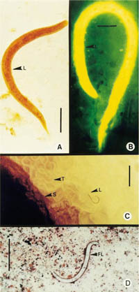 - Thể ký sinh trùng (Parasitic forms): Con giun cái mảnh, mỏng giống hình sợi chỉ, trong suốt, kích thước dài 2.2mm và rộng 0.05mm. Thực quản hình sợidài khoảng ¼ chiều dài cơ thể và có các điểm nối ở ruột, lỗ mở ra ở đoạn ngắn sau đuôi. Các con giun đang chửa, dạng bào thai chứa khoảng 10-20 trứng nằm đơn độc bên trong tử cung. Âm hộ mở ratương ứng với gai nhọn ở vị trí 1/3 sau của cơ thể; con giun đực có hình thoi, dài 0.7mm và 0.04m chiều rộng, thực quản mỏng nhỏ. Hai gai nhọn tương xứng, đuôi nhọn và sắc cạnh và cong xuống cố định ở bụng.