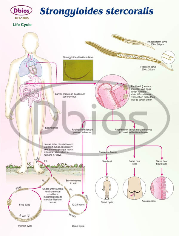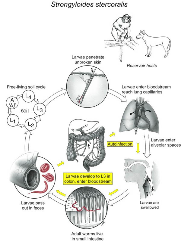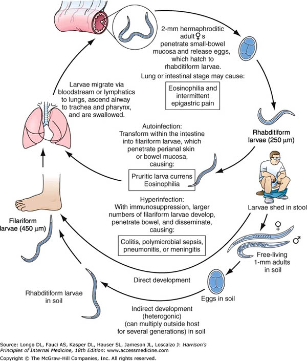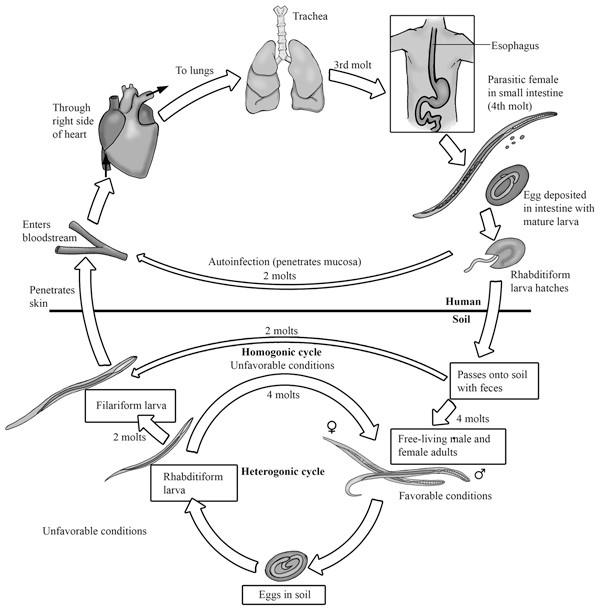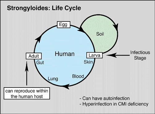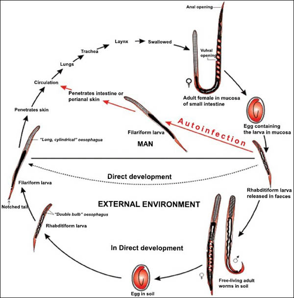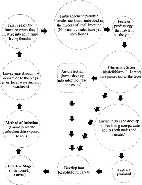 Trong một vài điều kiện, chu kỳ ký sinh xảy ra, ấu trùng giai đoạn 1 (Rhabditiform larvae) lột vỏ 2 lần để tạo ra thể nhiễm trong vòng vài ngày. ấu trùng giai đoạn nhiễm sống trên bề mặt của lớp đất, sống trên các thực vật và tồn tại khoảng vài ngày. Khi tiếp xúc với da người, chúng xâm nhập gây ra viêm da ở vi trí xuyên vào. Chúng tấn công vào mạch máu nhỏ hoặc hệ mạch lympho, đi đến tim rồi đến phổi. Sau khi xuyên qua phế nang, chúng đến hệ hô hấp, đến hầu họng rồi xuống thực quản đến ruột non. Quá trình lột vỏ có thể diễn ra trong suốt quá trình di chuyển đến hệ hô hấp và/ hoặc khi chúng đến ruột non và trưởng thành ở đó. Con giun cái đào hàm trong niêm mạc ruột và đẻ trứng trong thời gian 17 ngày kể từ khi ấu trùng tiếp xúc/ xuyên da. Lượng trứng đẻ ra không vượt quá 50 trên một ngày. Một số tác giả cho rằng không có giun cái và giun đực có khả năng parthenogenic (Chandler và cs, 1961; Muller và cs, 1975; Beaver và cs, 1984).