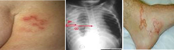 - Ở da: Có những đường ngoằn nghèo (thường là ngang thắt lưng, quanh hậu môn) do ấu trùng di chuyển. Các vết bầm máu (kích thước khoảng 3-4 cm) rải rác ở các chi, thân mình và nổi mề đay.