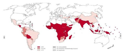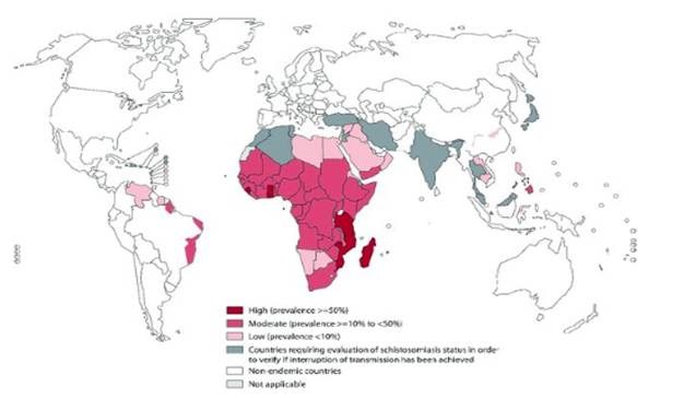 Hình 1. Phân bố địa lý bệnh sán máng trên toàn cầu với các tỷ lệ mắc khác |Nguồn: WHO, 2023
