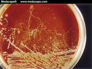 A. Di chuyển của ấu trùng Strongyloides hình rắn bò có thể nhìn thấy như cụm vi khuẩn di chuyển thành các vệt dài trên thạch nuôi cấy đờm màu chocolate. Mẫu này thu nhận từ một bệnh nhân đã tử vong do bệnh giun lươn lan tỏa khi dùng thuốc corticosteroids để điều trị u não. B. Làm rõ hình bên thấy các vạch rõ ràng của cụm vi khuẩn do ấu trùng giun lươn di chuyển. |
