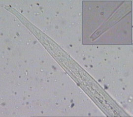 Ấu trùng giai đoạn 3 (L3), có kích thước 600-700 μm x 20-24 μm, với khoang miệng chiếm 1/3-1/2 chiều dài đoạn cuối trước cơ thể, thực quản hình trụ (1/2 chiều dài cơ thể), đuôi hình V và không có vỏ bọc.