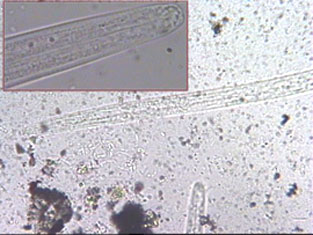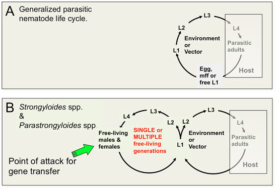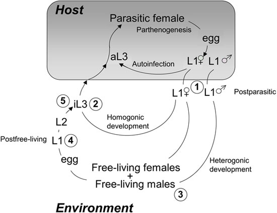Ấu trùng giai đoạn đầu (L1), ấu trùng dạng rhabditiform kích thước 200-300 μm x 16-20 μm có mọt khoang miệng ngắn, thực quản (1/3 chiều dài cơ thể) và mầm sinh dục lộ ra;