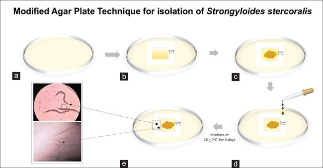 Mỗi mẫu phân được tập trung và xét nghiệm theo phương pháp tập trung FEAC và Baermann. Đối với APC, đĩa thạch được ủ trong điều kiện 28°C trong 2 ngày. Sự có mặt của giun lươn S. stercoralis trong đĩa thạch được phát hiện bằng mắt thường với các vệt ngẫu nhiên trên bề mặt thạch, soi dưới kính hiển vi xác định sự có mặt ấu trùng hoặc con trưởng thành còn sống di chuyển tự do. Xét nghiệm vi thể với dung dịch formalin 10% rửa trên bề mặt thạch để xác định ký sinh trùng.