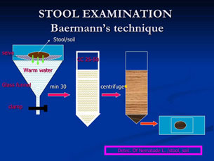Trước đây, xét nghiệm Baermann đòi hỏi trang thiết bị phức tạp và không phải áp dụng thường quy trong chẩn đoán thực hành tại các bệnh viện. Hiện nay chỉ cần có các thiết bị đặc chủng chuyên dụng như các cốc dạng ly rượu có đế chân bằng nhựa để làm xét nghiệm. Một mẫu phân được huyền phù trong nước để trong một cái bát thủy tinh để trong thời gian ít nhất 8 giờ, để cho các ấu trùng trong mẫu phân có cơ may đi ra khỏi khối phân và vào trong nước, di chuyển một cách ngẫu nhiên. Ấu trùng không thể bơi và rơi xuống đáy của phần trũng sâu của cốc thủy tinh-nơi mà chúng có thể thu lại để soi dưới kính hiển vi.
