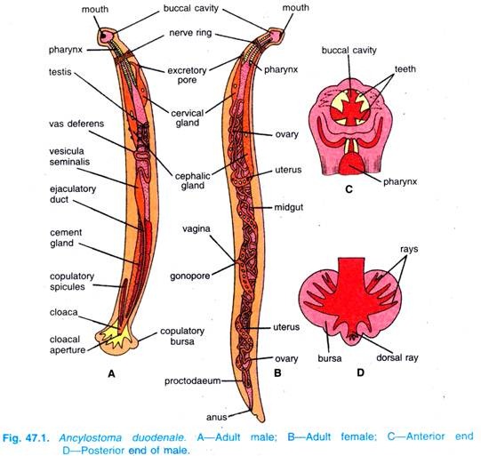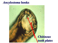 C: Ancylostoma caninum, 3 đôi răng; D: Ancylostoma duodenale, 2 đôi răng.