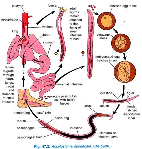 Nếu chúng đi xuyên qua da, chúng sẽ xâm nhập vào các mạch máu nhỏ dưới da, di chuyển đến phổi và rồi chúng rời ruột thông qua khí quản, thực quản và dạ dày. Trong trường hợp như vậy, ấu trùng phát triển thành ấu trùng giai đoạn 3 đầu tiên trong thành ruột non. Tiếp đó, ấu trùng giai đoạn 4 xuất hiện trong vòng 47 giờ sau khi nhiễm trùng. Ấu trùng giai đoạn 5 hay con giun chưa trưởng thành xuất hiện sau 6 ngày kể từ khi nhiễm và sau 2 tuần kể từ khi nhiễm, chúng phát triển thuần thục về giới tính.
