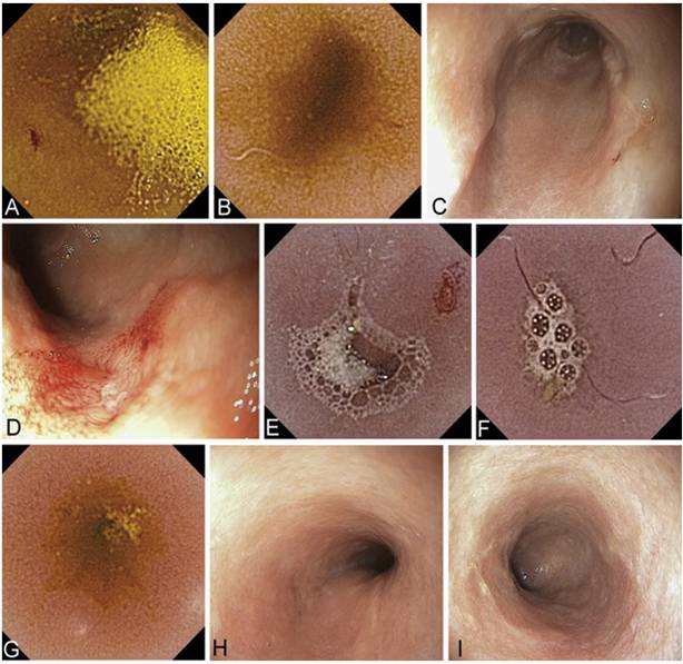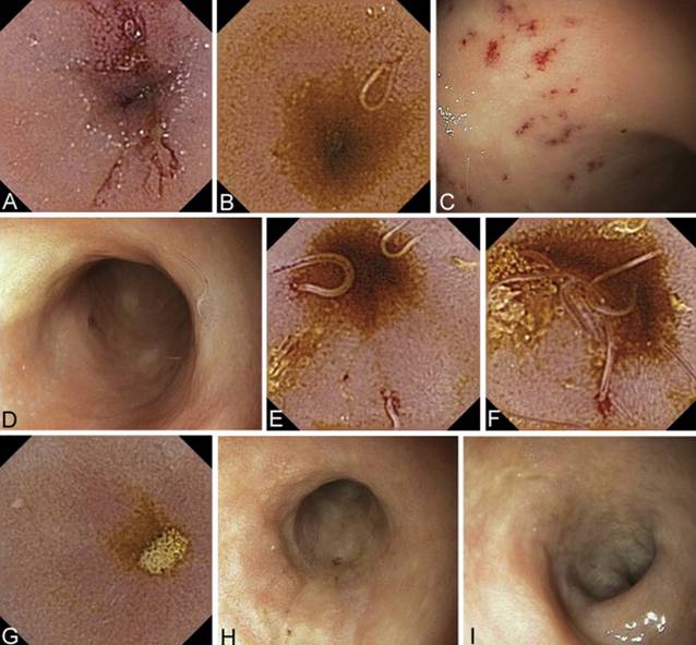 (A) Niêm mạc ruột non bị xuất huyết, 7 ngày sau khi nhiễm; (B) Giun móc A. caninum còn non vào ngày thứ 9 sau nhiễm; (C) Bị trí ăn máu bị bỏ vào ngày thứ 11; (D) Giun móc chưa trưởng thành ngày thứ 11 được ngụy trang xung quanh bởi các vi nhung mao ruột và một lượng lớn máu bao quanh; (E) Các giun móc đơn độ làm tổ trong máu vào ngày 12; (F) Ba con giun A. caninum dính vào niêm mạc ngày thứ 12; G) Các vùng trắng bạc trên thành ruột vào ngày thứ 15 (2 ngày sau điều trị), vết chảy máu coi như đã chữa lành; (H và I) Thành ruột coi như đã bình thường ngày 16 (3 ngày sau điều trị). Panels A, B và từ E đến G là các hình ảnh nội soi ống mềm và panel C, D, H và I là hình ảnh nội soi kinh điển.