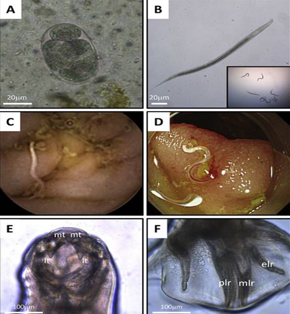 Hình 11. 1A: Trứng giun móc giai đoạn phân khúc sớm tìm thấy trong phân sau khi nuôi cấy trên môi trường formalin-ethyl Mori; C: Giun móc ở ruột qua nội soi ống mềm;