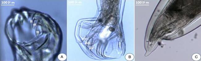 D: Kéo giun ra cho thấy răng bên (lateral tooth-lt) lớn và răng giữa (median tooth-mt) hơi nhỏ; F: Túi vùng giao cấu gắn chặt với nhau, mặc dù tách khỏi khe bên ngoài.