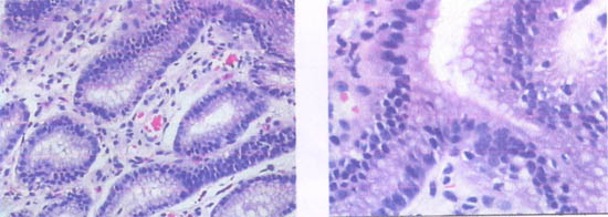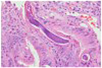 + Không có hình ảnh dị sản hoặc tăng sinh của các khối ác tính cũng như có mặt của vi khuẩn Helicobacter pylori; nhuộm haematoxylin và eosin, niêm mạc dạ dày qua hình ảnh cắt ngang của ấu trùng giun lươn Strongyloides stercoralis (xem mũi tên). Các mẫu cắt của tá tràng cho thấy niêm mạc ruột non có cả S. stercoralis. Lớp lamina propria chohình ảnh thâm nhiễm nhiều tế bào viêm mạn tính với nhiều bạch cầu ái toan, bào tương và lymphocytes;