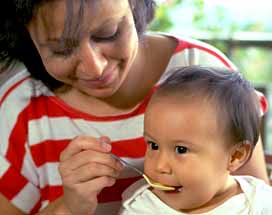 Để đáp ứng nhu cầu ngày càng tăng của trẻ sơ sinh lúc 6 tháng tuổi, thức ăn đặc nghiền nên được giới thiệu như là một bổ sung khi tiếp tục cho con bú. Thực phẩm cho em bé có thể được chuẩn bị đặc biệt hoặc chế biến từ các bữa ăn gia đình. WHO lưu ý rằng cho con bú không nên được giảm khi bắt đầu cho trẻ thức ăn đặc (breastfeeding should not be decreased when starting on solids); thực phẩm phải được đưa ra với một cái muỗng hoặc ly, không phải để trong chai (food should be given with a spoon or cup, not in a bottle); thực phẩm phải sạch, an toàn và có sẵn tại địa phương (food should be clean, safe and locally available) và nhiều thời gian là cần thiết cho trẻ em học cách ăn thức ăn đặc (ample time is needed for young children to learn to eat solid foods).