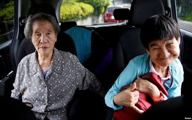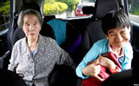 Bệnh nhân Shinobu Sakamoto bị bệnh Mianmata bẩm sinh, 61 tuổi, và mẹ bà, Fujie, ngồi trong một chiếc xe