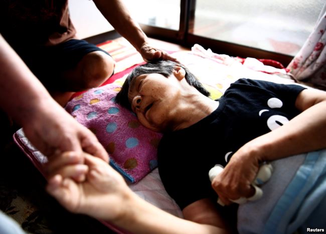 Bệnh nhân Shinobu Sakamoto bị bệnh Minamata bẩm sinh, 61 tuổi, nhận được điều trị
