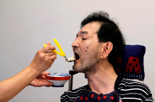 Một người chăm sóc cho bệnh nhân Yuji Kaneko bị bệnh bẩm sinh Minamata tại Oruge-Noa, một nhà dưỡng lão cho người tàn tật trong đó có bệnh nhân bị bệnh Minamata, ở Minamata, Kumamoto Prefecture, Nhật Bản, ngày 13 tháng 9, 2017. Kaneko sinh ra ở Minamata năm 1955 và tất cả thành viên trong gia đình đều được chứng nhận là bệnh nhân bị bệnh Minamata.