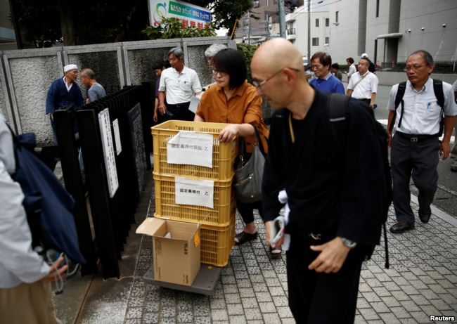 Những người ủng hộ cho nguyên đơn đòi hỏi phải được cấp giấy chứng nhận như là các bệnh nhân bị bệnh Minamata thực hiện các văn bản quy phạm pháp luật trước phiên tòa của họ tại Kumamoto, tỉnh Kumamoto Prefecture, Nhật Bản, ngày 11 tháng 9 , năm 2017.