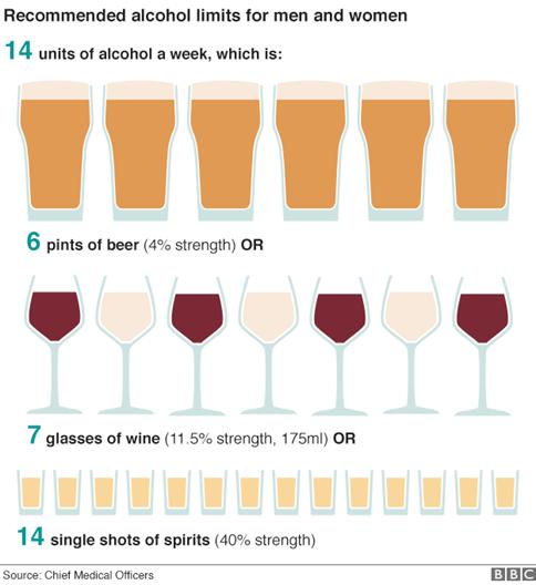 Ngày 8/1/2016. BBC News-Những hướng dẫn mới về rượu bia: Bạn có uống nhiều hơn bạn nghĩ không? Những hướng dẫn mới đầy khắt khe về rượu bia đã cắt giảm những giới hạn uống bia rượu được khuyến nghị và cho rằng không có mức độ uống nào là an toàn cả. Các quan chức y tế lãnh đạo của Anh cho biết nghiên cứu mới cho thấy bất kỳ lượng rượu bia có thể làm gia tăng nguy cơ ung thư và hướng dẫn mới cho biết đàn ông và phụ nữ uống bia rượu thường xuyên nên tiêu thụ không quá 14 đơn vị 1 tuần-tương đương với 6 panh bia hoặc 7 ly rượu. Phụ nữ có thai không nên uống bia rượu. Hướng dẫn còn khuyến nghị rằng nếu mọi người uống, thì mức độ trung bình nên trong 3 ngày hoặc nhiều hơn và rằng nên có một vài ngày nghỉ không uống. Hướng dẫn còn khuyến nghị, mọi người không nên để dồn lại lượng rượu bia và uống tất cả trong một hoặc hai lần. Những lần uống say bí tỉ làm gia tăng nguy cơ các tai nạn và chấn thương.