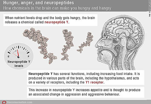 Một lý do khác nóng nảy khi đói có liên quan đến sự giận dữ là vì cả hai được kiểm soát bởi các gen chung, việc sản sinh này là do một loại gen neuropeptide Y, một hóa chất não bộ tự nhiên phóng thích vào não khi bạn đói kích thích các hành vi ăn uống tham lam bằng việc làm theo nhiều cơ quan thụ cảm trong não bao gồm một cơ quan gọi là cơ quan thụ cảm Y1. Bên cạnh việc hoạt động trong não để kiểm soát sự nóng nảy khi đói, neuropeptide Y và cơ quan thụ cảm Y1 cũng kiểm soát sự nóng nảy hoặc hành vi gây hấn. Vì lý do này, những người có mức độ neuropeptide Y cao trong dịch não tủy có xu hướng thể hiện sự nóng nảy cao. Như bạn có thể thấy, có vài chuỗi các phản ứng hóa sinh có thể làm bạn có xu hướng nóng nảy khi bạn đói. Nóng nảy khi đói chắc chắn là một cơ chế sinh tồn đã phụng sự có ích cho con người và các loài động vật khác, nghĩ về việc này giống như nếu các sinh vật đang đói bước lùi lại và nhã nhặn để những loài khác ăn trước chúng thì giống loài của chúng có thể tuyệt chủng. Trong khi nhiều nhân tố vật lý là nguyên nhân dẫn đến nóng nảy khi đói, các nhân tố tâm lý xã hội cũng có vai trò. Ví dụ như những sự ảnh hưởng văn hóa dù bạn diễn tả sự nóng nảy qua lời nói dù trực tiếp hay gián tiếp và vì chúng ta khác nhau qua tất cả những nhân tố này, không thực sự ngạc nhiên khi có những sự khác nhau khi mọi người bày tỏ sự nóng nảy khác nhau khi họ đói.
