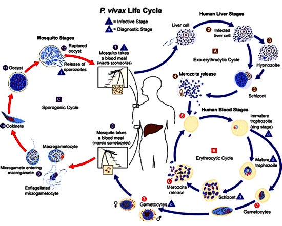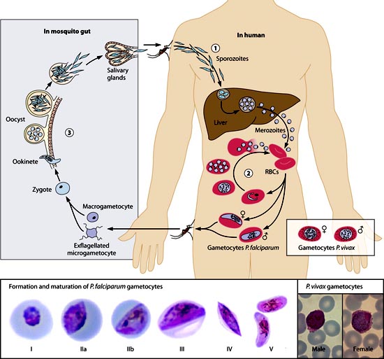 Trong chu kỳ KSTSR liên quan đến 2 vật chủ, trong quá trình ăn máu , muỗi cái Anopheles nhiễm sốt rét sẽ đẩy thoa trùng vào trong vật chủ người [1] . Các thoa trùng nhiễm vào tế bào ganvaf trường thành qua các giai đoạn tư dưỡng [2] và thể phân liệt [3] à tiếp đó chúng vở ra và ly giải nhiều merozoites [4]. Đáng chú ý trong số 5 loài ở trên chỉ có P. vivax và P. ovale có giai đoạn thể ngủ (dormant stage/ hypnozoites) có thể tồn tại trong gan và gây tái phát xa sau đó vài tuần thậm chí nhiều năm. Sau quá trình nhân lên này trong gan (chu trình schizogony ngoại hồng cầu [A] à các ký sinh trùng tiến hành nhiều quá trình nhân lên vô tính trong hồng cầu (chu trình schizogony hồng cầu [B] à Các merozoite nhiễm vào trong quá trình hồng cầu [5]. Các tư dưỡng nhẫn trưởng thành thành thể phân liệt rồi vở ra ly giải nhiều [6]. Một số KST biệt hóa thành giai đoạn hữu tính (giao bào) [7]. Các ký sinh trùng giai đoạn trong máu chịu trách nhiệm cho biểu hiện đặc điểm lâm sàng của bệnh.
