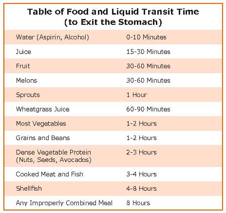 Thời gian tiêu hóa từng loại thức ăn khác nhau cũng khác nhau: Chẳng hạn, nước vào khi dạ dày rỗng thì thức ăn sẽ rời khỏi nhanh chóng và đi đến ruột non. Các trái cây, rau quả hoặc nước rau quả khoảng chừng 15 - 20 phút. Nước hoặc thức ăn nửa đặc nửa lỏng như salad hỗn hợp, rau và trái cây xay khoảng 20 - 30 phút. Trái cây dưa hấu khoảng 20 phút. Các thức ăn khác quả dưa như dịch ngọt, dung dịch từ lá cũng khoảng 30 phút,…Nghĩa là thức ăn càng đặc và cứng còn có giai đoạn tiêu hóa và nhòe vào các men phân giải thực phẩm,…nên thời gian tiêu hóa như bạn đề cầu sẽ khác nhau và lệ thuộc vào rất nhiều yếu tố.