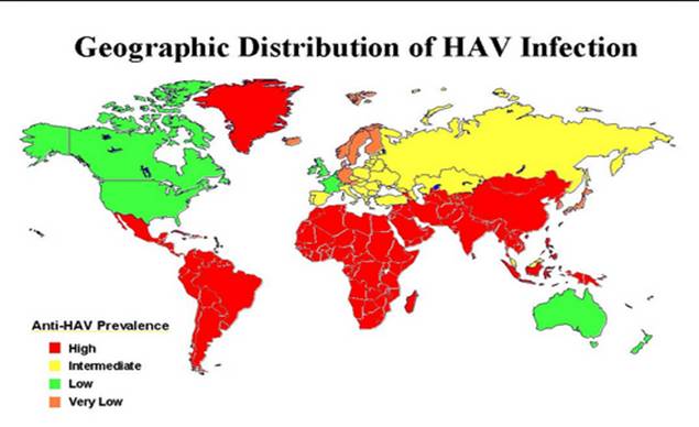 Trên thế giới hàng năm ước tính có 1,5 triệu trường hợp Viêm gan siêu vi A chủ yếu gặp ở châu Á, châu Phi và Đông Âu. Viêm gan siêu vi A là bệnh lây qua đường tiêu hóa, nguồn lây chủ yếu từ người bệnh sang người lành qua đường phân - miệng.Nguồn bệnh liên quan đến nguồn nước, thực phẩm bị nhiễm bẩn nhất là do ăn phải các loại sò, trai, ốc, hến chưa được nấu chín hoặc ăn các thực phẩm khác như rau sống không được rửa sạch. Các dụng cụ cá nhân, quần áo của người bệnh có thể là nguồn lây nhưng ít quan trọng. Bệnh lưu hành chủ yếu ở những vùng kém vệ sinh, kinh tế khó khăn và tỉ lệ phát triển dân số cao. Tác nhân gây bệnh xuất hiện trong phân khoảng 1-2 tuần trước khi có triệu chứng lâm sàng.