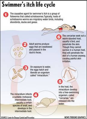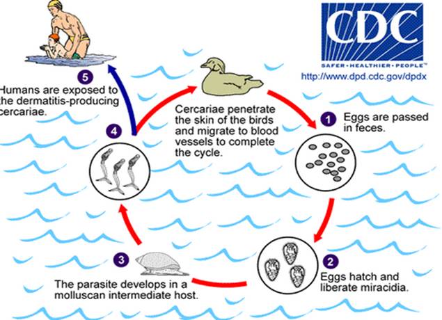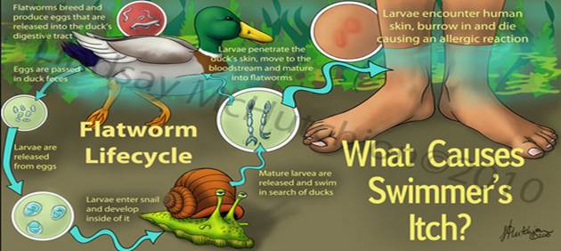 Các nhà khoa học đã phát hiện có ít nhất 25 loại ấu trùng sán máng ở nước ngọt và 4 loại ấu trùng sán máng ở nước mặn gây viêm da cho người khi hoạt động dưới nước. Đó là những loại ấu trùng sán máng ký sinh ở động vật lông vũ như vịt, chim và các động vật có vú sống ở dưới nước. Sán máng trưởng thành đẻ trứng trong cơ thể vật chủ ký sinh, trứng được thải ra ngoại cảnh rơi vào nước và nở thành ấu trùng lông bơi tự do trong nước và xâm nhập vào vật chủ phụ là loại ốc thích hợp. Trong cơ thể ốc, ấu trùng lông sẽ phát triển thành ấu trùng đuôi; một ấu trùng lông có thể phát triển thành hàng trăm nghìn ấu trùng đuôi và được phóng thích bơi lội tự do ở trong nước.