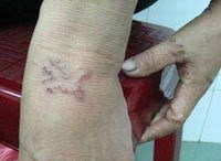 Ấu trùng giun di chuyển dưới da ở lòng bàn tay phải Bệnh nhân Tô Thị Lý, 41 tuổi, xã Lý Học, huyện Vĩnh Bảo, Hải Phòng (Ảnh: Thạc sĩ Đào Mạnh Khoa) |