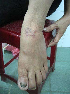 Ấu trùng giun di chuyển dưới da ở mu bàn chân trái của một người bệnh tại Hải Phòng (Ảnh: Thạc sĩ Đào Mạnh Khoa) |