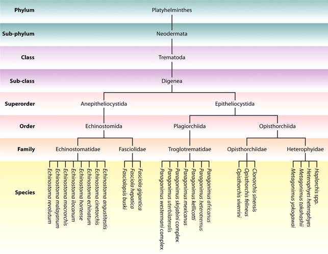 -Sán lá ở gan mật (hepatobiliary fluke) gồm Fasciola hepatica, Fasciola gigantica, Clonorchis sinensis, Opisthorchis felineus, Opisthorchis viverrini, Dicrocoelium dendriticum, Dicrocoelium hospes.