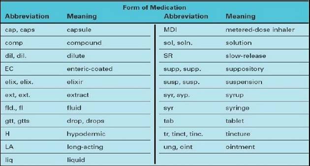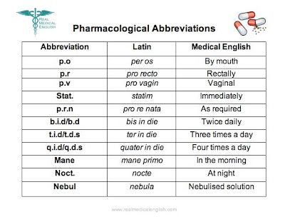 Đôi khi chúng ta còn bắt gặp các góc từ latinh, song song với các thuật ngữ tiếng Anh đi kèm như bảng trình bày dưới đây. Một số khác lại viết tắt các cụm từ như số lượng, thành phần, pha loãng thuốc như thế nào,…