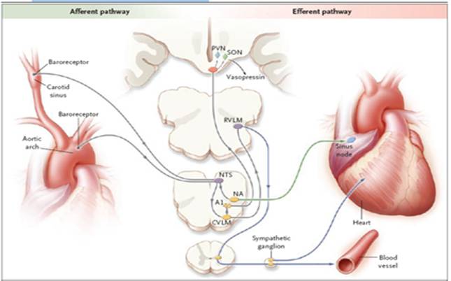 Về cơ chế bệnh sinh : Nguyên tắc “nước chảy chỗ trũng”: khi một người ở tư thế đứng, do ảnh hưởng của trọng lực, máu sẽ bị giữ ở các tĩnh mạch lớn ở phần thấp của cơ thể (500-1000ml). Sự giảm hồi lưu tĩnh mạch gây ra giảm cung lượng tim, do đó làm giảm huyết áp (HA). Ở người bình thường, các áp thụ quan ở quai động mạch chủ và thể cảnh ghi nhận sự thay đổi về HA, hoạt hóa các phản xạ thần kinh tự chủ (Hình 1). Hệ giao cảm tăng nhịp tim, co bóp cơ tim, và tăng trương lực co thắt tĩnh mạch. Hệ phó giao cảm bị ức chế cũng làm tăng nhịp tim. Khi đứng lâu, sự hoạt hóa hệ renin-angiotensin-aldosterone và bài tiết ADH giữ muối, nước làm tăng thể tích tuần hoàn. HHATT xảy ra khi các cơ chế cân bằng nội môi bị phá vỡ: