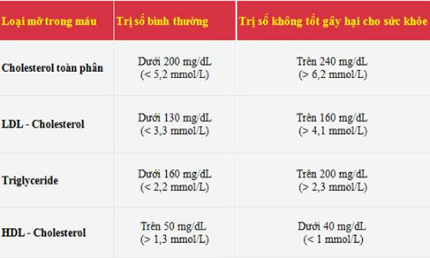 Liên quan đến câu hỏi của anh, có một số thông tin và ngưỡng giá trị xét nhiệm mỡ máu khác nhau sẽ có giá trị có ý nghĩa khác nhau. Tuy nhiên, các giá trị này không sai lệch nhau nhiều lắm giữa các quốc gia và tổ chức liên quan đưa ra định nghĩa.