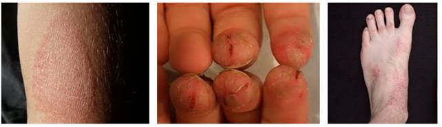 - Eczema tiếp xúc : Xuất hiện đầu tiên ở vùng tiếp xúc, thường là vùng hở, có khi in rõ hình vật tiếp xúc (hình quai dép, dây đồng hồ, kính đeo mắt...) Tổn thương cơ bản là da đỏ xung huyết, hơi nề, trên bề mặt có mụn nước, có thể có hình thái mãn tính khô dày cộm có vảy. Dừng tiếp xúc với dị vật bệnh thuyên giảm, tiếp xúc lại bệnh vượng lên. Làm phản ứng da với chất tiếp xúc cho kết quả dương tính