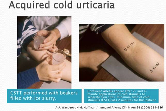 Triệu chứng ngứa, phát mày đay trên diện tích da tiếp xúc với lạnh, thường kéo dài khoảng nửa giờ hoặc kéo dài hơn, nữ hay gặp hơn nam giới. Sưng tay khi đang cầm nắm các vật lạnh, sưng môi khi ăn thức ăn lạnh, sưng lưỡi và họng, có thể gây khó thở do phù nề hầu họng hay đường hô hấp. Bệnh nhân có thể bị bất tỉnh, nhịp tim nhanh, sưng chân tay hoặc thân mình, đau quặn bụng, nôn, tiêu chảy, phù não, khó thở cấp tính rất nguy hiểm đến tính mạng. Điều trị mề đay do lạnh gồm: Tránh phơi nhiễm với nhiệt độ. Dùng thuốc ngăn ngừa và giảm bớt triệu chứng với thuốc kháng histamin giúp giảm ngứa và nổi mề đay như loratadine, fexofenadine, cetirizine… Nếu mề đay do lạnh vì một vấn đề sức khỏe tiềm ẩn thì cần dùng thuốc điều trị bệnh nền đó như cảm cúm, nhiễm virut, mycoplasma, viêm phổi. Mề đay do lạnh đôi khi rất nguy hiểm đến tính mạng của bệnh nhân, vì vậy, mọi người cần chú ý phòng tránh. Nếu bạn chưa bị nổi mề đay do lạnh, bạn nên thử xem mình có bị mẫn cảm với nhiệt độ lạnh hay không. Bạn dùng một viên nước đá áp vào da cẳng tay trong 4-5 phút rồi bỏ ra, quan sát vùng da đó trong 10 phút. Kết quả: Khi da ấm trở lại, nếu có một vòng mề đay xuất hiện kèm theo ngứa là bạn thuộc người có cơ địa dễ dị ứng với lạnh. Bạn cần tránh nhiễm lạnh, không ngâm tay chân trong nước lạnh, không lội qua sông, qua suối khi trời lạnh vì có thể nguy hiểm đến tính mạng. Không có cách nào để tránh bị nổi mề đay do lạnh ở lần đầu tiên, nhưng có thể giúp ngăn ngừa bằng cách tránh tiếp xúc với nhiệt độ lạnh, đặc biệt là để vùng da hở tiếp xúc với lạnh.