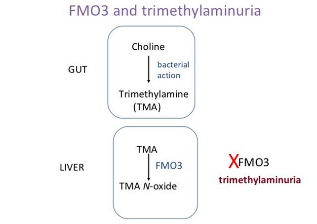 Thông thường, cơ thể sản xuất TMA trong ruột dưới tác dụng của vi khuẩn giúp tiêu hóa thực phẩm chứa nhiều chất cholin như trứng, gan và cá. Khi số lượng TMA trong cơ thể đầy đủ thì sự tiêu hóa diễn ra bình thường nhưng ở các trường hợp có rối loạn chuyển hóa gây thiếu hụt enzym FM03 sẽ khiến TMA không được chuyển hóa mà tích tụ lại và toát ra khỏi cơ thể (qua mồ hôi, nước tiểu, hơi thở).
