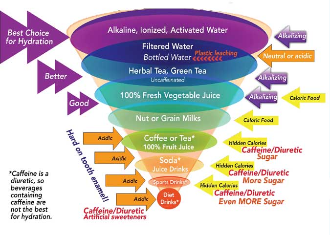 Khuyến cáo mỗi người cần uống 8 ly nước (mỗi ly chứa khoảng 200ml) mỗi ngày, nhưng trên thực tế nên uống nhiều hơn, khoảng 3 lít một ngày cho nam giới và 2,2 lít cho phụ nữ. Lý do của sự khác biệt này là do nam giới thường có khối cơ lớn hơn phụ nữ, vì vậy cơ thể nam giới dự trữ nước nhiều hơn. Bạn cũng có thể lấy chất lỏng trong thực phẩm, như trong các loại rau và súp. Hãy nhớ cần phải uống nhiều hơn bạn thường làm trong các tình huống sau: trong thời tiết nóng; trước, trong và sau khi hoạt động thể chất; phụ nữ đang mang thai hoặc cho con bú; khi đang gặp những bệnh nhiễm khuẩn kèm sốt, hoặc bệnh cúm.