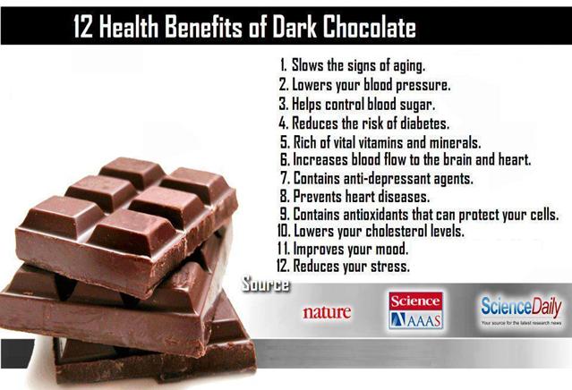 Hầu hết mọi người đều thích chocolate . Họ ăn nó khi thấy mình stress, để thấy vui vẻ, để họ có được tâm trạng tốt hơn. Mặc dù chocolate rất phổ biến và có nhiều lợi ích cụ thể, bạn vẫn phải chú ý đến lượng tiêu thụ của mình. Nếu bạn ăn ngấu nghiến chocolate suốt ngày, chắc chắn bạn sẽ bị mất nhiều lợi ích của nó. Chocolate có tỷ lệ ca cao từ 70% trở lên sẽ rất hữu ích. Ba muỗng canh riêng bột ca cao chứa 1,5gam chất béo; 3g chất xơ; không có chất béo no và tổng cộng là 60 calo. Còn những loại chocolate sữa chứa 17g chất béo, 10g chất béo bão hòa tất cả là 270 calo. Vậy bạn biết thứ mình cần rồi chứ? Ăn chocolate tốt, chẳng hạn như chocolate đen sẽ giúp bạn nhiều, đặc biệt nếu bạn đang ăn kiêng. Dưới đây là một số lợi ích của chocolate .