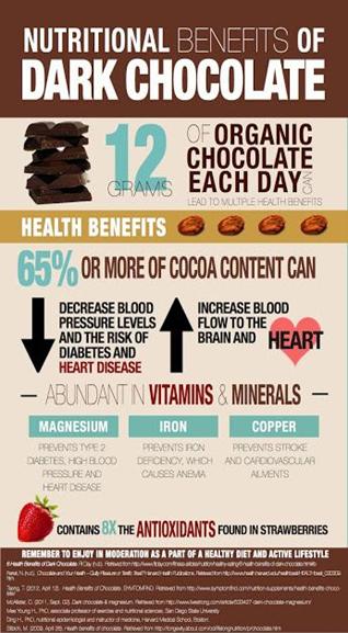 Giảm nguy cơ mắc bệnh tim mạch:Những bằng chứng rõ ràng về chất chống ôxy hóa là flavanols có trong chocolate rất có lợi cho sức khỏe. Chocolate , đặc biệt là chocolate đen có hàm lượng rất cao flavonoids. Nghiên cứu trên tạp chí British Medical Journal kết luận, tiêu thụ chocolate có thể giảm nguy cơ phát triển bệnh tim đến 35%. Bạn có nguy cơ bị bệnh tim nếu tiểu cầu của bạn đông lại, hình thành cục máu đông và gây tắc mạch máu. Nếu bạn tiêu thụ chocolate thường xuyên bạn sẽ cải thiện lưu lượng máu động mạch của mình, không bị tắc nghẽn. Đó là nhờ flavanols trong hạt ca cao giúp thúc đẩy dòng máu và làm mạch máu của bạn thư giãn và lưu thông. Hiệu quả có lợi trên rất nhiều bệnh lý tim mạch của chocolate đã được chứng minh dựa trên tác động của flavanols và procyanindins trên chức năng thành mạch cho thấy chocolate có lợi cho sức khỏe tim mạch.