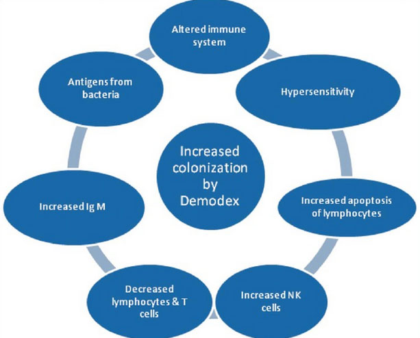 Nhiễm trùng Demodex spp. là một bệnh lý do ngoại ký sinh trùng gây nên trên các vị trí nang lông, tuyến bả của người. Một số nguyên nhân có thể dẫn đến tăng quần thể Demodex spp. như thay đổi hệ thống miễn dịch, các kháng nguyên từ vi khuẩn, tăng tính nhạy cảm với tác nhân gây bệnh, tăng hiện tượng tự chế tế bào lympho, tăng tế bào giết tự nhiên, giảm các tế bào lymp và lympho T,