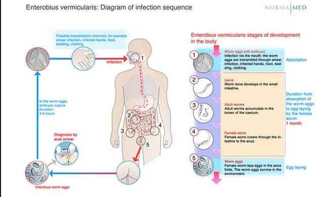 Giun cái di chuyển đến trực tràng, sau khi giao phối và nếu không bị tống ra theo phân thì sẽ tiếp tục di chuyển đến vùng đáy chậu (thường vào ban đêm), nơi đó chúng có thể đào thải ra khoảng 11.000-16.000 trứng. Trứng trưởng thành có khả năng gây nhiễm trong vòng 6-8 giờ và dưới điều kiện thuận lợi, tối ưu, khả năng gây nhiễm vẫn duy trì trong môi trường kéo dài đến 3 tuần.Vì thời gian ủ bệnh ngắn cho đến khi trứng gây nhiễm, các trứng này đào thải và nếu vô ý bằng cách nào đó chúng di chuyển và nằm dưới kẻ móng tay, từ đó dễ dàng đưa vào miệng hình thành phương thức lan truyền bệnh.
