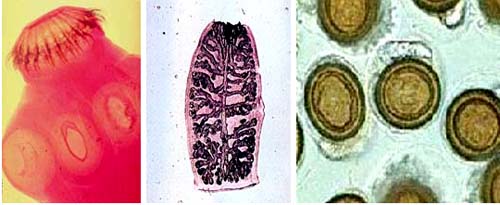 Hình bên trái: Đầu sán dây; Hình giữa: Đốt sán dây; Hình bên phải: Trứng sán dây |