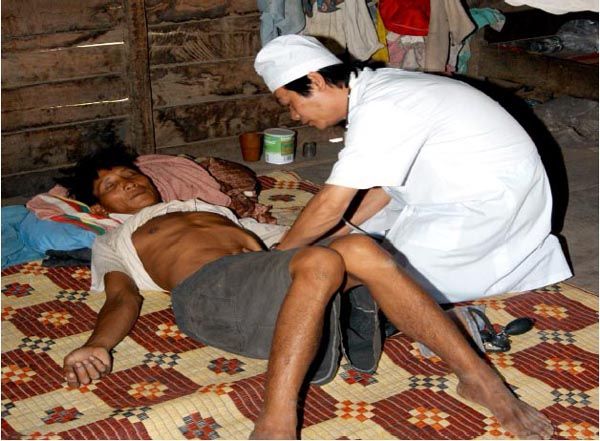 Cán bộ y tế đang khám cho bệnh nhân sốt rét tại thôn bản |
