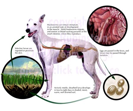 Giun móc chó (Ancylostoma caninum), ký sinh ở ruột non chó hoặc mèo. Về đặc điểm hình thái cấu tạo, bao miệng mỗi bên có 3 đôi răng chia 3 nhánh, con đực dài 9-12 mm, đuôi phát triển có túi kitin, Spicule dài bằng nhau dài 0.74 –0.87mm, đoạn cuối nhọn, trứng hình bầu dục, hai đầu thon đều, gồm 2 lớp vỏ. Trứng mới thải ra bên ngoài trong có 8 tế bào phôi. Về chu kỳ phát triển: trứng theo phân thải ra ngoài gặp điều kiện ngoại cảnh thích hợp, sau 20 giờ tới một vài ngày hình thành ấu trùng trong trứng. Ấu trùng chui ra khỏi trứng, qua 6 -7 ngày, lột xác 2 lần để tạo thành ấu trùng gây nhiễm (L3). Ấu trùng gây nhiễm dài 0.59 -0.69mm, có thể bò ở nền chuồng hay cây cỏ quanh chuồng. Nếu gia súc ăn phải ấu trùng gây nhiễm vào trong phổi, lột xác lần 3 tạo ấu trùng giai đoạn 4 (L4), về ruột lột thành ấu trùng giai đoạn 5 (L5) sau 14 -20 ngày trở thành dạng trưởng thành.