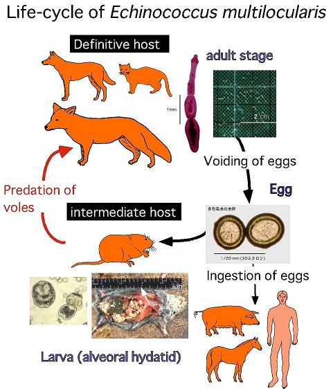 Echinococcus multilocularis là một loại sán dây hình cyclophyllid cùng với một số thành viên khác của giống Echinococcus (đặc biệt là E. granulosus), sinh ra bệnh Echinococcosis trên một số động vật có vú sống trên mặt đất, gồm chó sói, cáo, chó rừng,động vật ăn thịt như loài ở Bắc Mỹ, chó nhà và con người. Không như E. granulosus, E. multilocularis sinh ra nhiều nang nhỏ (còn gọi là locules) mà chúng lan rộng khắp các cơ quan nội tạng của động vật nhiễm. Ăn phải hoặc nuốt phải các nang sán này, thường do chó ăn phải các loài gặm nhấm nhiễm, dẫn đến nhiễm nặng sán dây. Về phân loại khoa học thì loài KST này thuộc giới động vật, ngành Platyhelminthes, lớp Cestoda, bộ Cyclophyllidea, họ Taeniidae, giống Echinococcus, loài Echinococcus multilocularis (Leuckart, 1863). Người nhiễm phải E. multilocularis có thể không có triệu chứng trong nhiều năm. Theo sau giai đoạn không triệu chứng này thí các triệu chứng có thể xảy ra là đau đầu, buồn nôn, nôn mửa, đau bụng. Vàng da rất hiếm nhưng gan lớn là một dấy hay gặp. Chu kỳ sinh học của E. multilocularis liên quan đến các vật chủ chính hay vật chủ tiên phát và vật chủ trung gian hay vật chủ thứ phát, mỗi vật chủ gắn liền với các giai đoạn khác nhau của ký sinh trùng. Cáo và chó nhà cũng như các chó khác là các vật chủ chính đối với giai đoạn trưởng thành của ký sinh trùng sán này. Đầu sán dây dính liền với niêm mạc ruột nhờ vào móc và giác hút. Rối tiếp đến, nó sinh ra hàng trăm trứng nhỏ, phát tán ra phân (Vuitton, 2009). Các động vật gặm nhấm hoang dại như chuột đóng vai trò như các vật chủ trung gian. Trứng bị tiêu hóa phải các loài gặm nhấm phát triển trong gan, phổi và các cơ quan khác để hình thành nên các nang multilocular. Người cũng có thể trở thành vật chủ trung gian thông qua tiếp xúc các động vật nhiễm hay ăn phải thức ăn, rau quả và nước nhiễm mầm bệnh. Chu kỳ hoàn thành sau khi một con cáo hay con chó ăn phải con gặm nhấm nhiễm nang. Các ấu trùng trong nang phát triển thành sán dây trưởng thành trong hệ tiêu hóa của vật chủ chính (Vuitton, 2009). Về phân bố bệnh này ở Việt Nam, theo chúng tôi có được những thông tin và báo cáo thì số báo cáo và dữ liệu về căn bệnh này vẫn còn hạn hữu. Ngoại trừ một số trường hợp hiếm nơi mà người nhiễm bị ăn bởi chó, con người khi đó sẽ là vật chủ tình cờ hay dead-end (một hình thức vật chủ trung gian không cho phép lan truyền đến vật chủ chính) đối với E. multilocularis. Tóm tắt chu kỳ như sau: