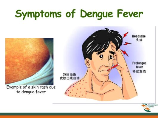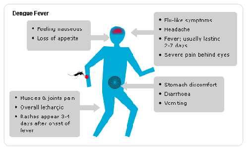 Hai biểu hiện nổi bật của sốt xuất huyết – Dengue là sốt và xuất huyết. Ngoài ra, bệnh nhân có thể có biểu hiện trụy tim mạch. Bệnh diễn tiến cấp tính, rất dễ dẫn đến tử vong nếu không được điều trị thích hợp kịp thời. Sốt cao 39.5 – 40oC, khởi phát đột ngột, liên tục kèm cảm giác lạnh, không có cơn run kiểu sốt rét. Thuốc giảm sốt có ảnh hưởng ít nhưng không cắt sốt. Trung bình sốt kéo dài 5 - 6 ngày. Một số ít trường hợp sốt kéo dài đến hai hoặc ba tuần sau đó tự hết mà không can thiệp gì. Kèm sốt là cảm giác nhức đầu, chóng mặt, buồn nôn.