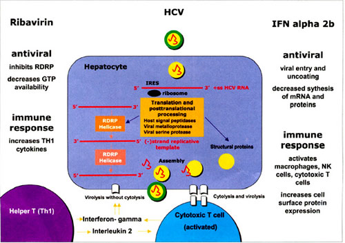 Ribavirin được phát hiện vào năm 1972, là một chất tương tự guanosine có phổ hoạt tính rộng chống lại các virut RNA và DNA gồm cả các flaviviridae như virut viêm gan C. Ribavirin có vai trò quan trọng trong phác đồ phối hợp với peg - interferon trong suốt quá trình điều trị. Ribavirin có tác dụng làm tăng đáp ứng cytokin kiểu 1 và đáp ứng tăng sinh tế bào T gây độc tế bào. Ribavirin có thời gian bán thải 44 - 49 giờ sau liều duy nhất và sẽ tăng cao sau khi dùng lâu dài, bởi thế sự thanh thải ribavirin cần nhiều tuần sau khi ngừng thuốc. Thanh thải ribavirin giảm nhiều ở bệnh nhân suy thận nên không dùng ở bệnh nhân có độ thành thải creatinin < 50ml/phút. Các tác dụng phụ hay gặp là gây tan máu, ngoài ra còn gây quái thai do đó không được dùng cho phụ nữ mang thai. Không dùng peg - interferon và hoặc ribavirin ở bệnh nhân viêm gan virut C mạn tính. Chống chỉ định tuyệt đối với bệnh nhân xơ gan mất bù, bệnh tự miễn, rối loạn nhịp tim, bệnh thiếu máu và thiếu máu cục bộ, suy thận, phụ nữ có thai và cho con bú, trẻ em dưới 18 tuổi. Cần thận trọng khi dùng cho các tương đối: thiếu máu 3 dòng, bệnh nhân có các rối loạn tâm thần, các rối loạn co giật.