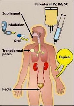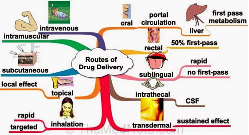 Để cơ thể xử lý các loại thuốc này là một quá trình vô cùng phức tạp, nhưng đã có cách để phá vỡ sự phức tạp này: Sau khi đưa thuốc vào cơ thể bằng các con đường đã nêu ở trên, thuốc sẽ di chuyển vào mạch máu để đến các cơ quan và các mô trong cơ thể. Từ đó thuốc sẽ sản sinh hoặc gây ra các hiệu ứng. Cuối cùng cơ thể chúng ta sẽ loại bỏ thuốc và các chất gắn liền với nó ra ngoài. Do đó có những loại và đường đi của thuốc sẽ nhằm trúng mục tiêu đích, tức là nó sẽ tiến thẳng tới phần cơ thể bị bệnh. Chẳng hạn, các loại thuốc hít sẽ hỗ trợ việc thở. Đường đi và loại thuốc cũng ảnh hưởng đến sự hoạt động nhanh của thuốc. Tiêm thuốc vào các cơ - chứa đầy các mạch máu - cũng là phương pháp dùng thuốc cực nhanh thẩm thấu vào cơ thể.