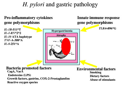 Mặc dù chưa biết một số nhiễm trùng H. pylori làm tăng nguy cơ ung thư dạ dày như thế nào, song một số nhà nghiên cứu đã suy xét rằng sự viêm thời gian dài lên các tế bào trong dạ dày sẽ dần trở nên ung thư hóa. Ý tưởng này được hỗ trợ bởi các thử nghiệm cho thấy tăng cytokine (interleukin-1-beta) đươn thuần trong dạ dày của chuột chuyển đổi gen gây viêm dạ dày rải rác và ung thư. Số lượng tế bào gia tăng từ tổn thương có thể làm tăng tế bào đột biến nhanh hơn và nhiều hơn. Một giả thuyết mà có thể giải thích các nguy cơ giảm ung thư tâm vị và ung thư tế bào tuyến thực quản trên những người nhiễm H. pyloriliên quan đến giảm đi tính acid trong dạ dày mà chúng ta thường thấy sau nhiều thập niên vi khuẩn H. pylori chiếm cứ. Sự giảm này sẽ làm giảm trào ngược acid vào trong thực quản, một yếu tố nguy cơ chính đối với ung thư tuyến thực quản lên phần trên của dạ dày và đoạn thực quản.