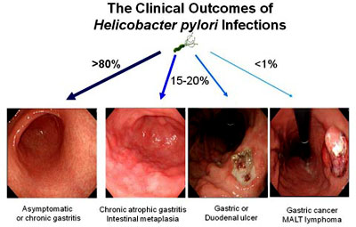 -Nhiễm trùng H. pylori là một nguyên nhân chính gây ung thư dạ dày và có liên quian đến tăng nguy cơ hình thành u lymphoma liên quan đến niêm mạc dạ dày (gastric mucosa-associated lymphoid tissue (MALT) lymphoma);