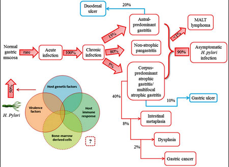 Rồi kể từ đó, sự tồn tại ở vị trí trong dạ dày của H. pylori dần được chấp nhận tăng lên và xem đó như một nguyên nhân quan trọng ung thư dạ dày và sinh u lymphoma ở niêm mạc dạ dày (gastric mucosa-associated lymphoid tissue_MALT lymphoma). Nhiễm trùng vi khuẩn này cũng có liên quan đến nguy cơ giảm adenocarcinoma ở thực quản. Sựu lan rộng của H. pylori được nghĩ đến là do nguồn thực phẩm và nguồn nước tiêu thụ bị nhiễm bệnh thông qua con đường tiếp xúc miệng miệng. Trong hầu hết quần thể dân cư, vi khuẩn nhiễm phải lần đầu tiên trong thời trẻ. Các trẻ em sống trong điều kiện đông đúc, chật chội và sống dưới tình trạng kinh tế xã hội thấp hơn, nên khả năng nhiễm trùng dễ dàng hơn.